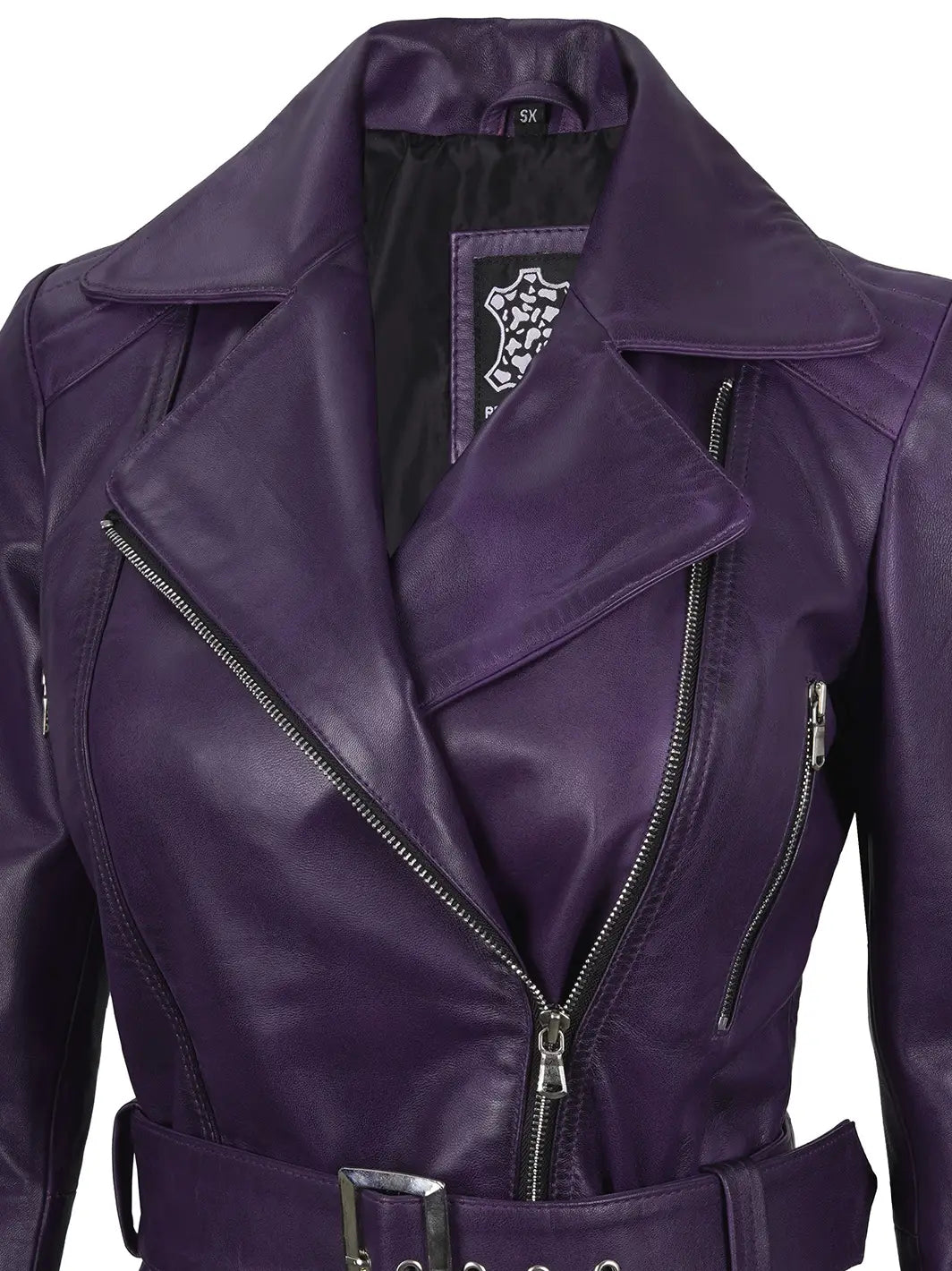 Make a bold statement with the Victoria Asymmetrical Purple Womens Biker Jacket. This eye-catching jacket combines the daring elements of biker fashion with a striking purple color, ensuring you stand out in any crowd.