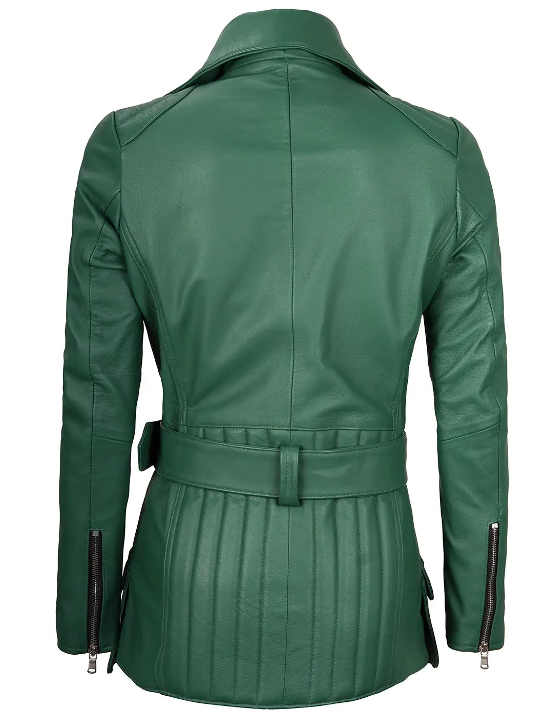 This striking green leather biker jacket is perfect for those who want to stand out. It’s not just about following trends; it’s a way to show off your unique personality and fearless fashion sense.