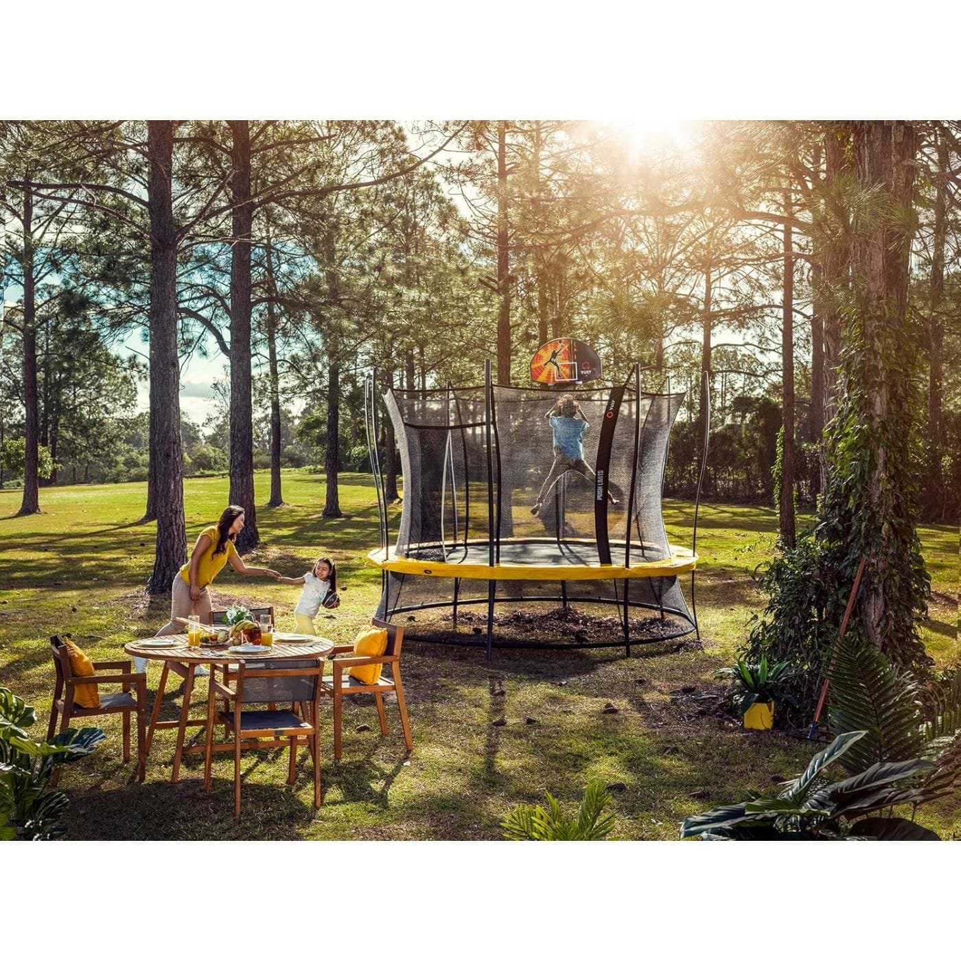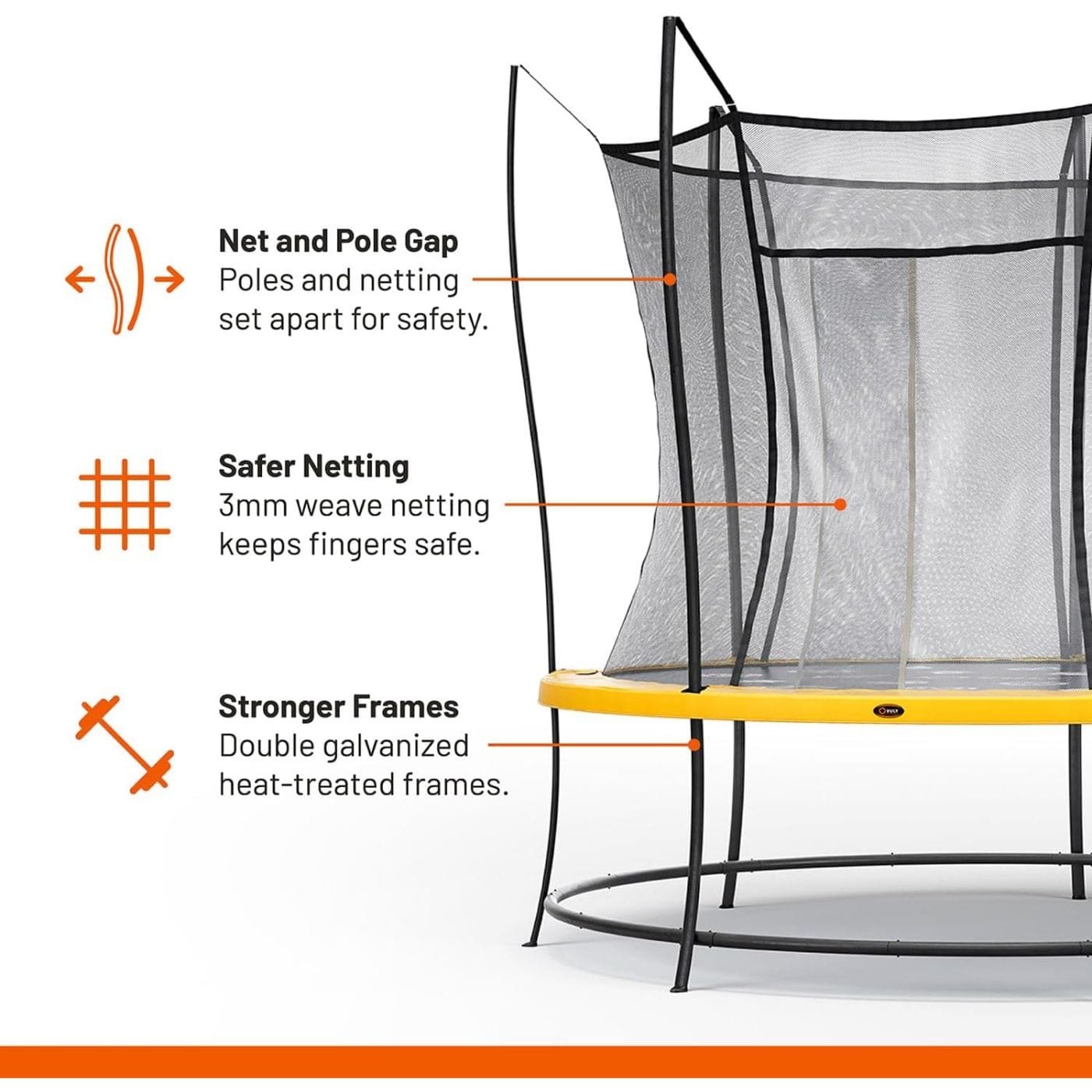 ๐๐๐ญ๐ฎ๐ซ๐๐ฌ: Enhanced safety features of the Vuly Lift 2 Trampoline include a 3mm net weave designed to safeguard fingers and curved net poles to minimize impact risks. The zip-free door further ensures no accidental contact with springs, poles, or frame, providing a worry-free bouncing experience for families.