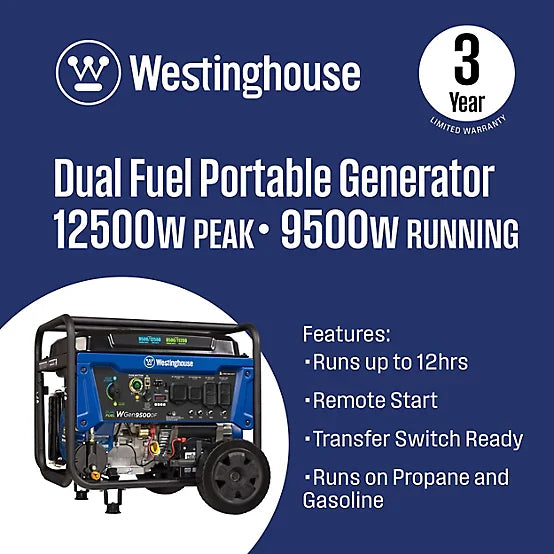 Westinghouse 12,500/9,500-Watt Dual-Fuel Portable Generator, Electric Start, Transfer Switch Ready