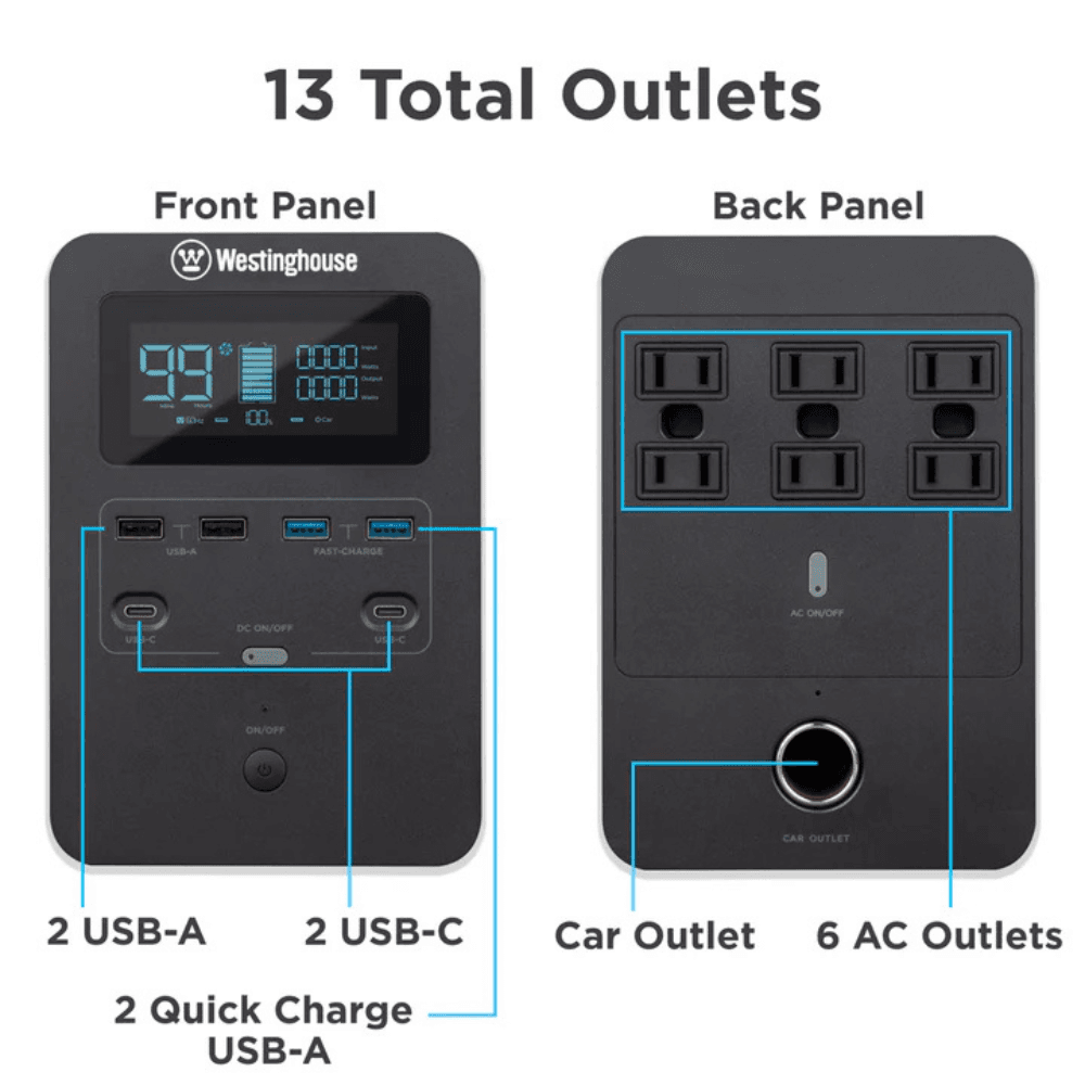 Features a variety of output ports including standard AC outlets, USB ports, and a DC port. This versatility allows you to power or charge laptops, smartphones, lights, and more—all from one unit.