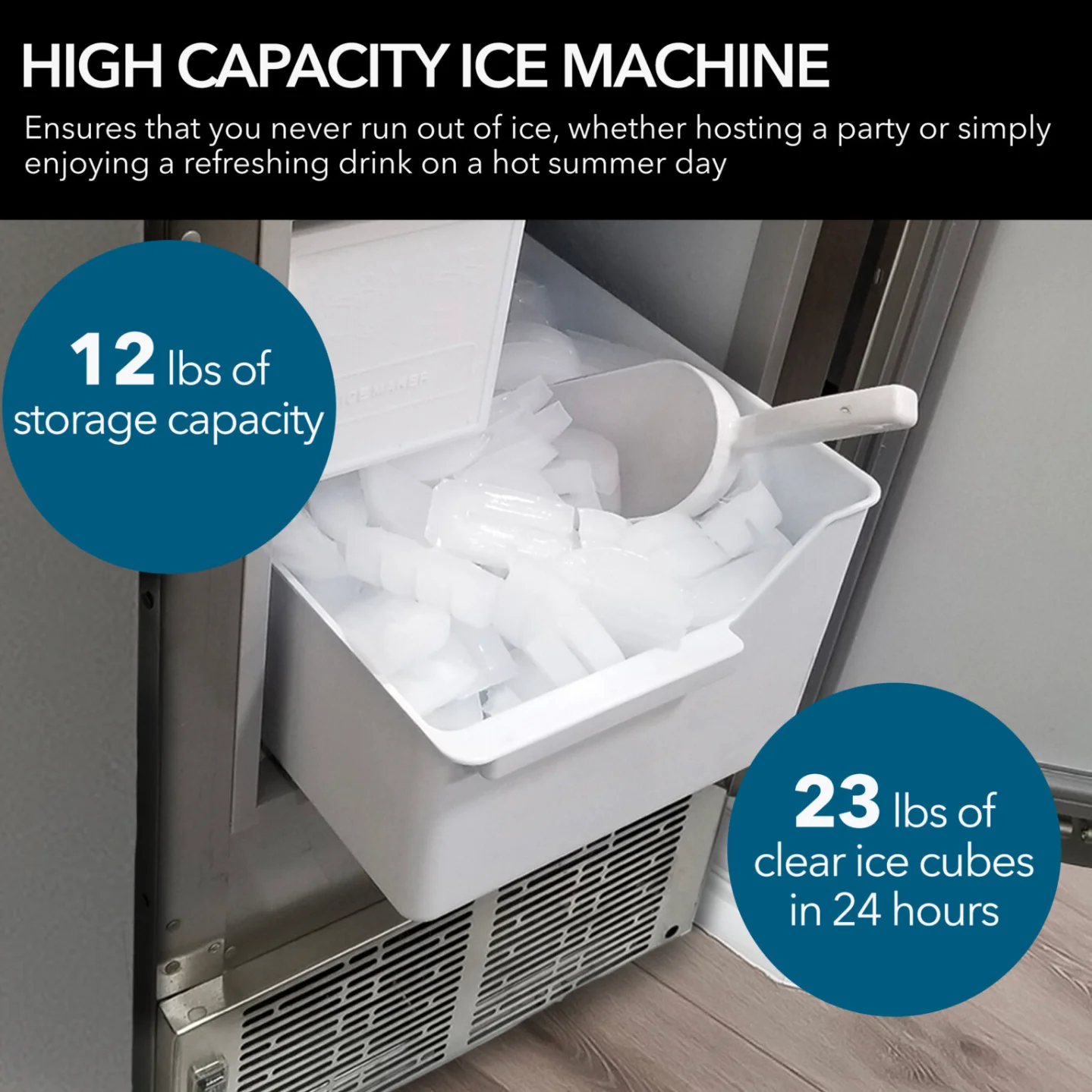 Makes 23 lbs of crescent-shaped ice cubes in 24 hours