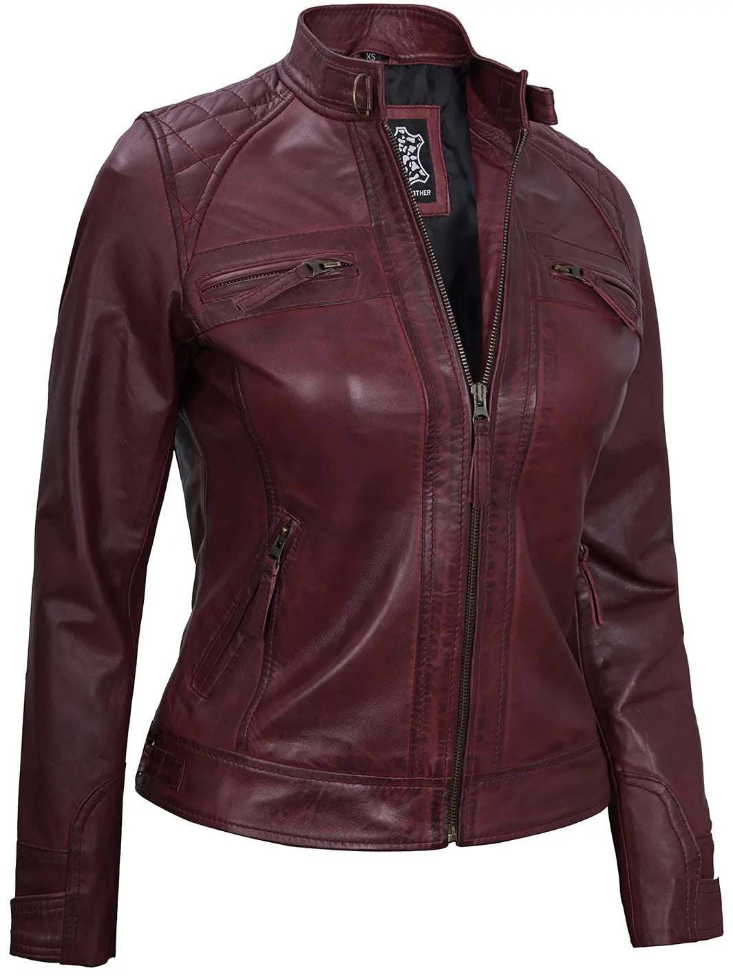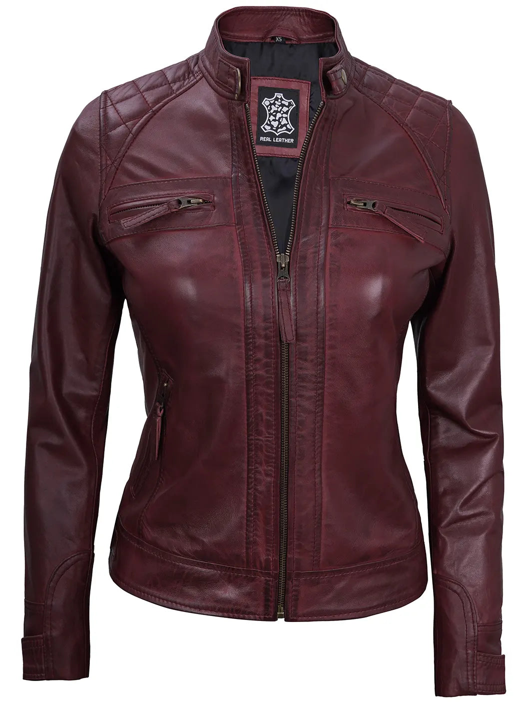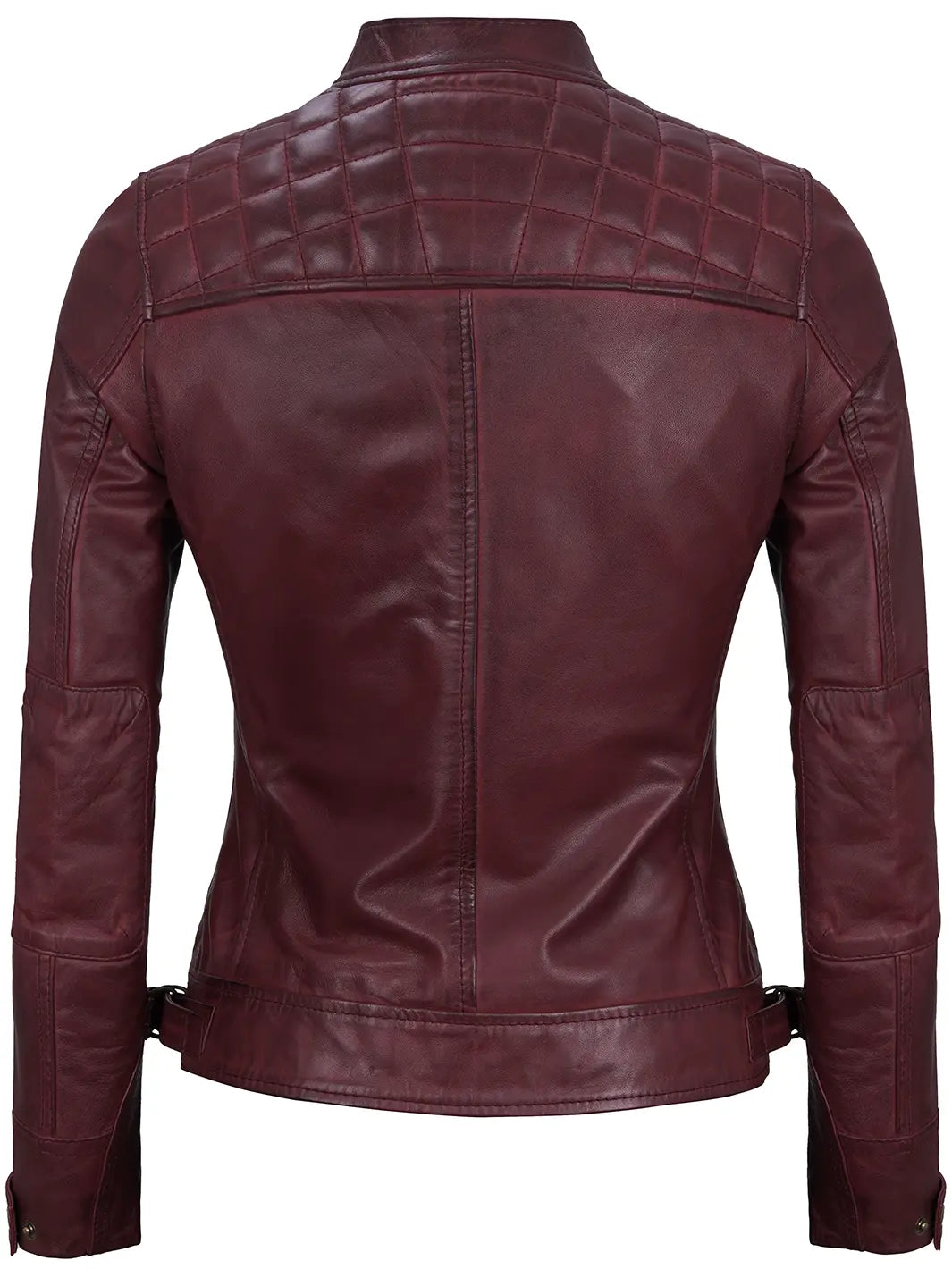 Johnson Women’s Maroon Quilted Cafe Racer Leather Jacket