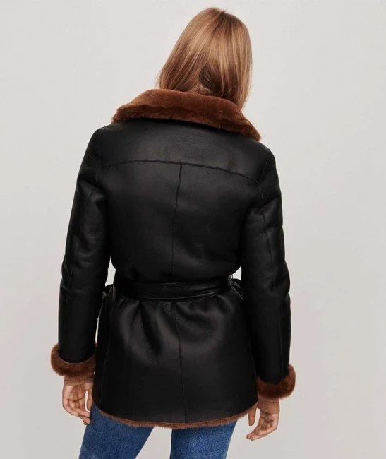 Enhance your winter wardrobe with the Women’s Shearling Leather Jacket – a durable, comfortable, and stylish addition. Features adjustable waist belt and multiple pockets for convenience.