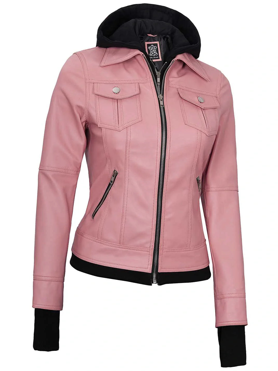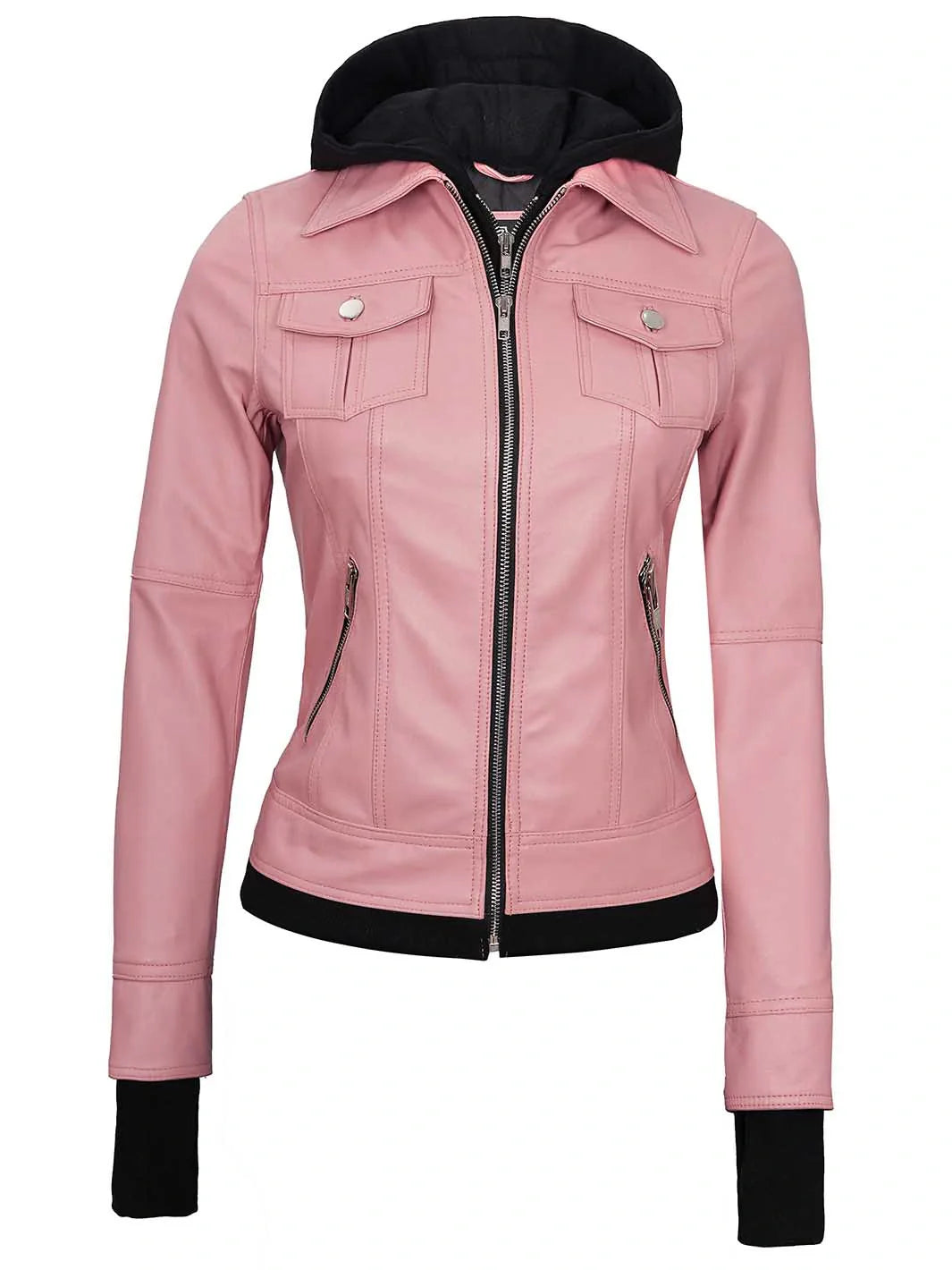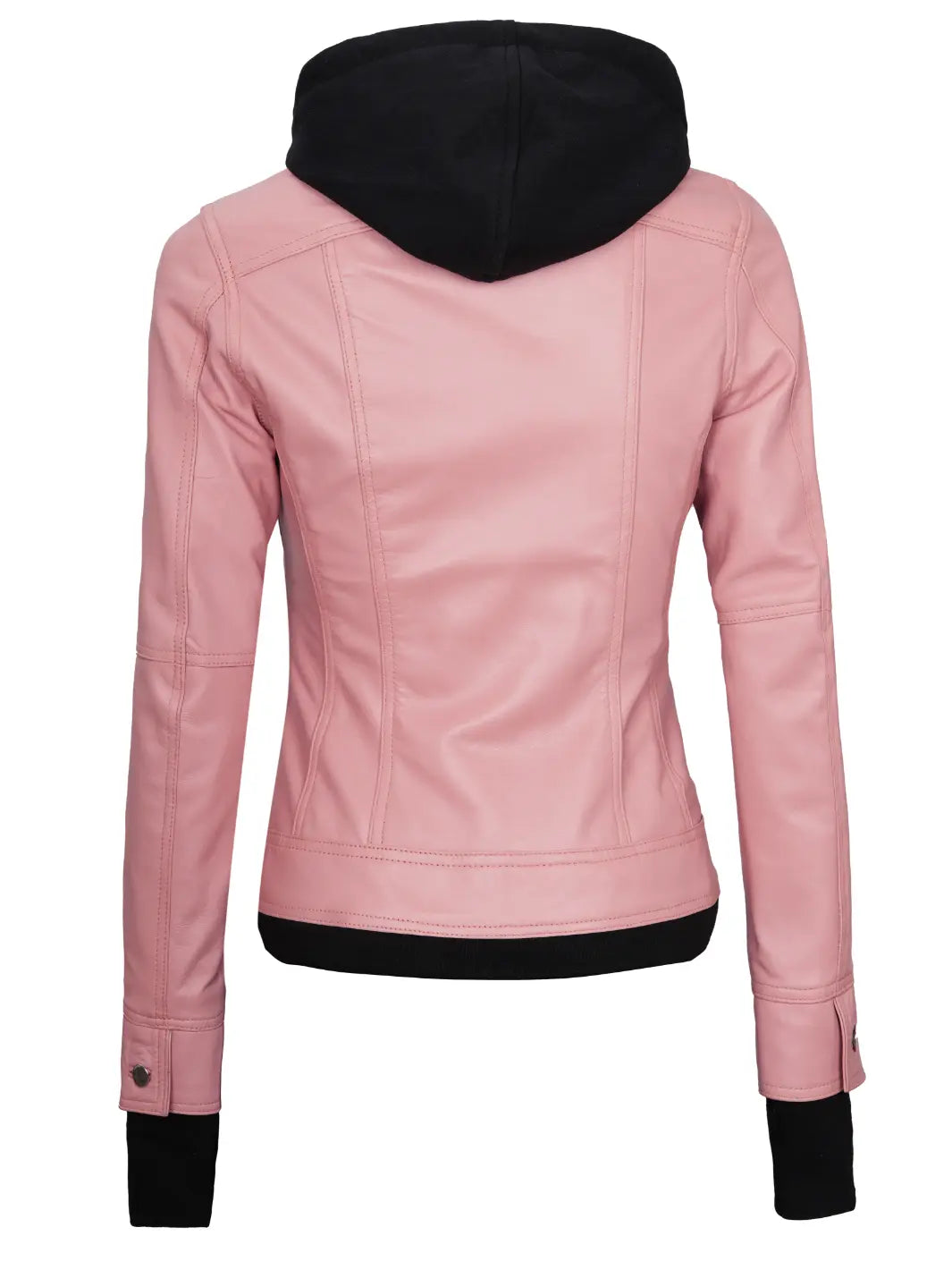 Women’s Pink Hooded Leather Motorcycle Jacket