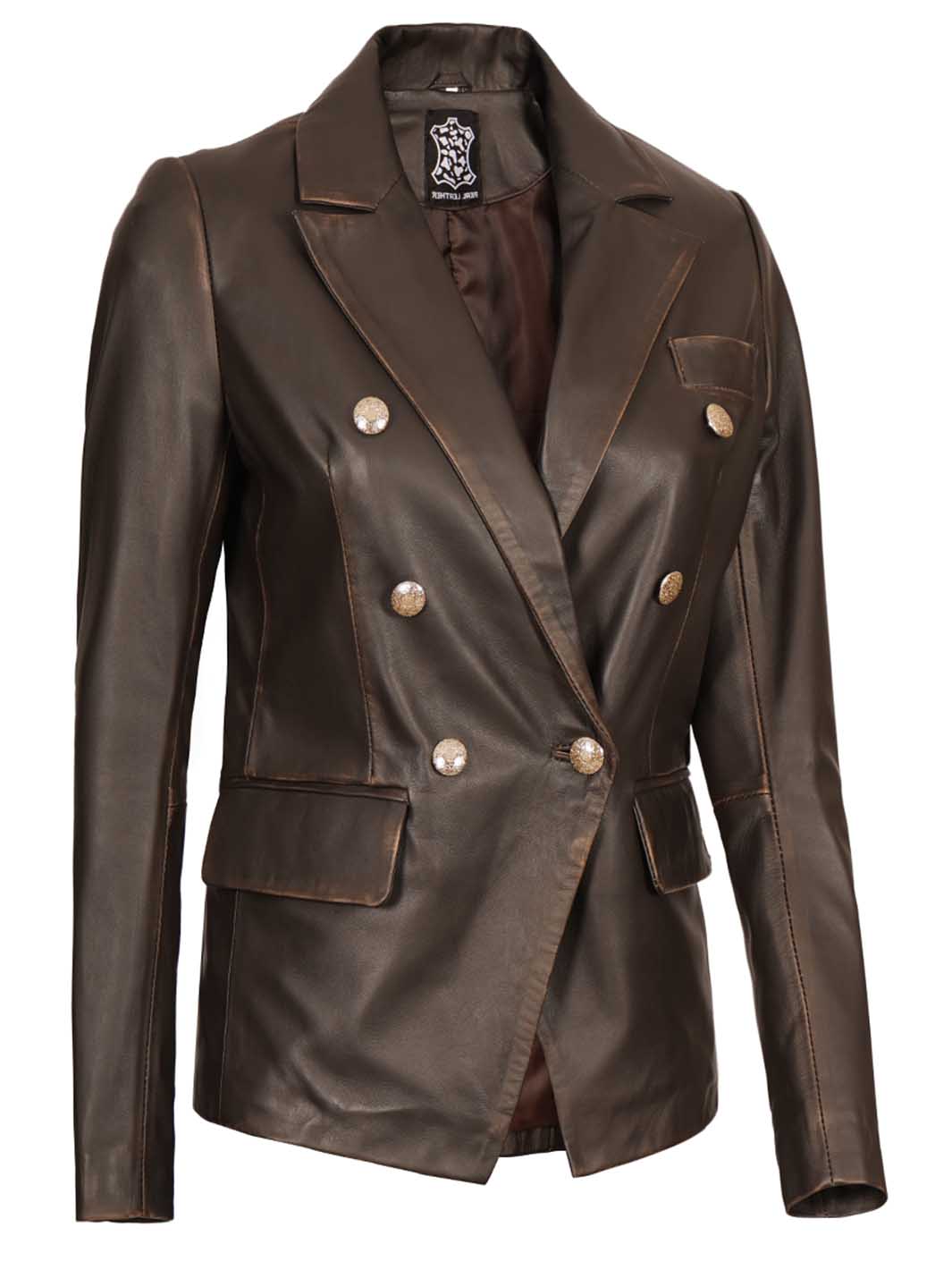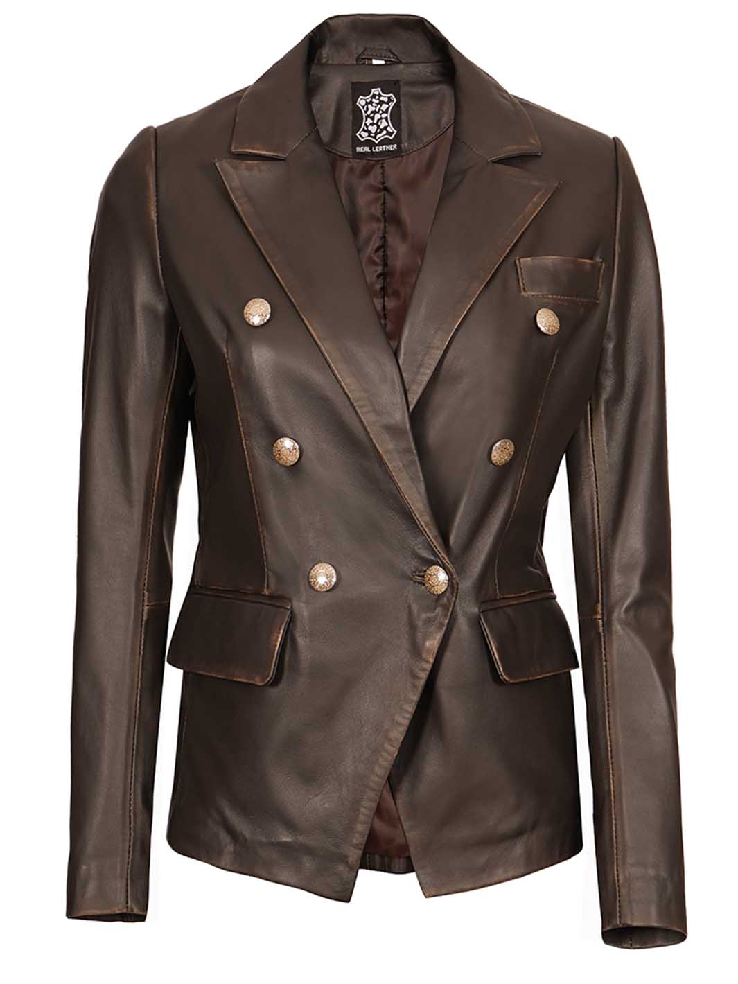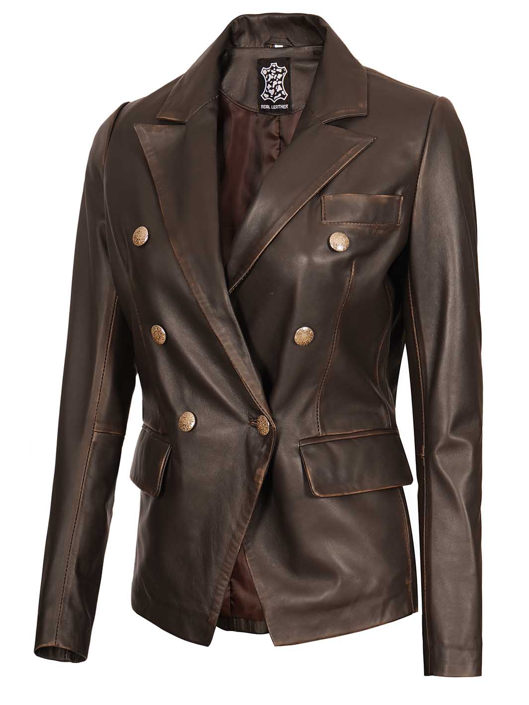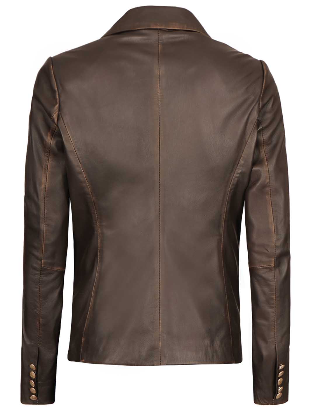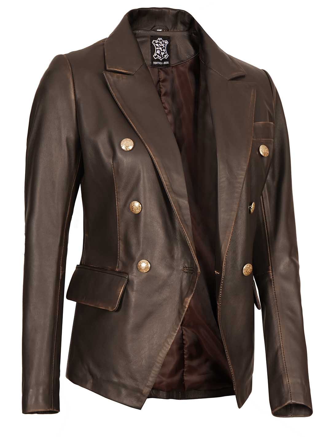 Womens Rub Off Double Breasted Real Leather Blazer
